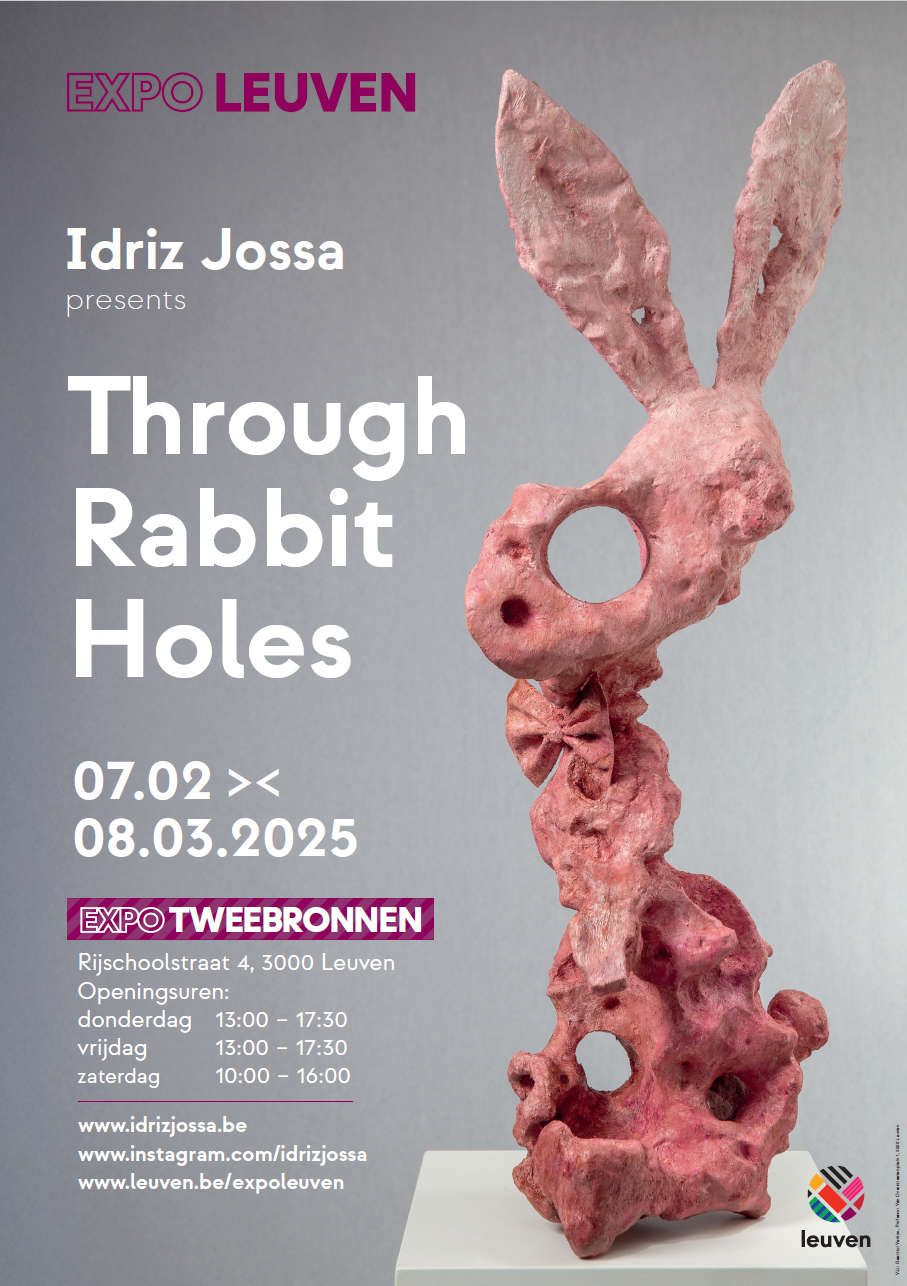 De tentoonstelling Through Rabbit Holes van Idriz Jossa is een diepgaande en filosofische verkenning van symboliek, de vergankelijkheid van iconen en de spanningen tussen het moderne en het oude. Het werk onderzoekt de betekenis van het konijn als symbool van vruchtbaarheid, seksualiteit en tijd, waarbij Jossa gebruikmaakt van twee contrasterende representaties van het konijn: het Vlaamse Reus-konijn en de Playboy Bunny.